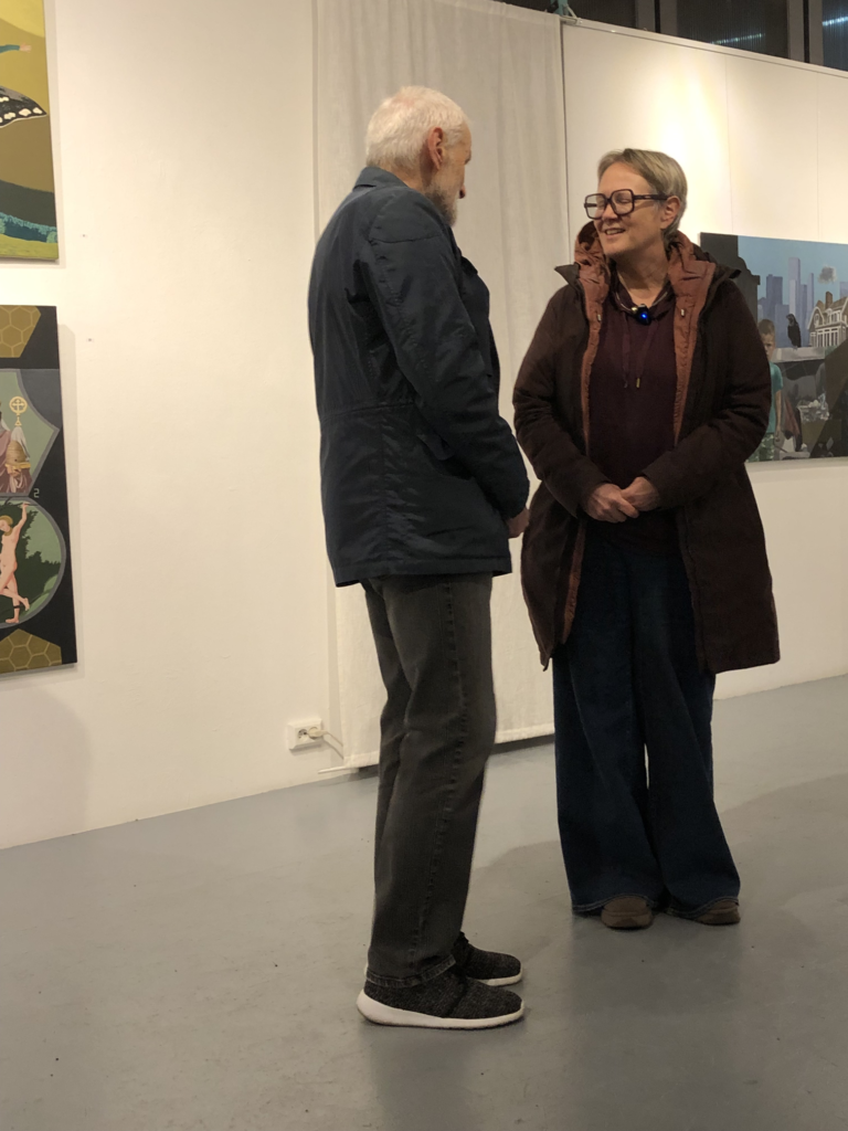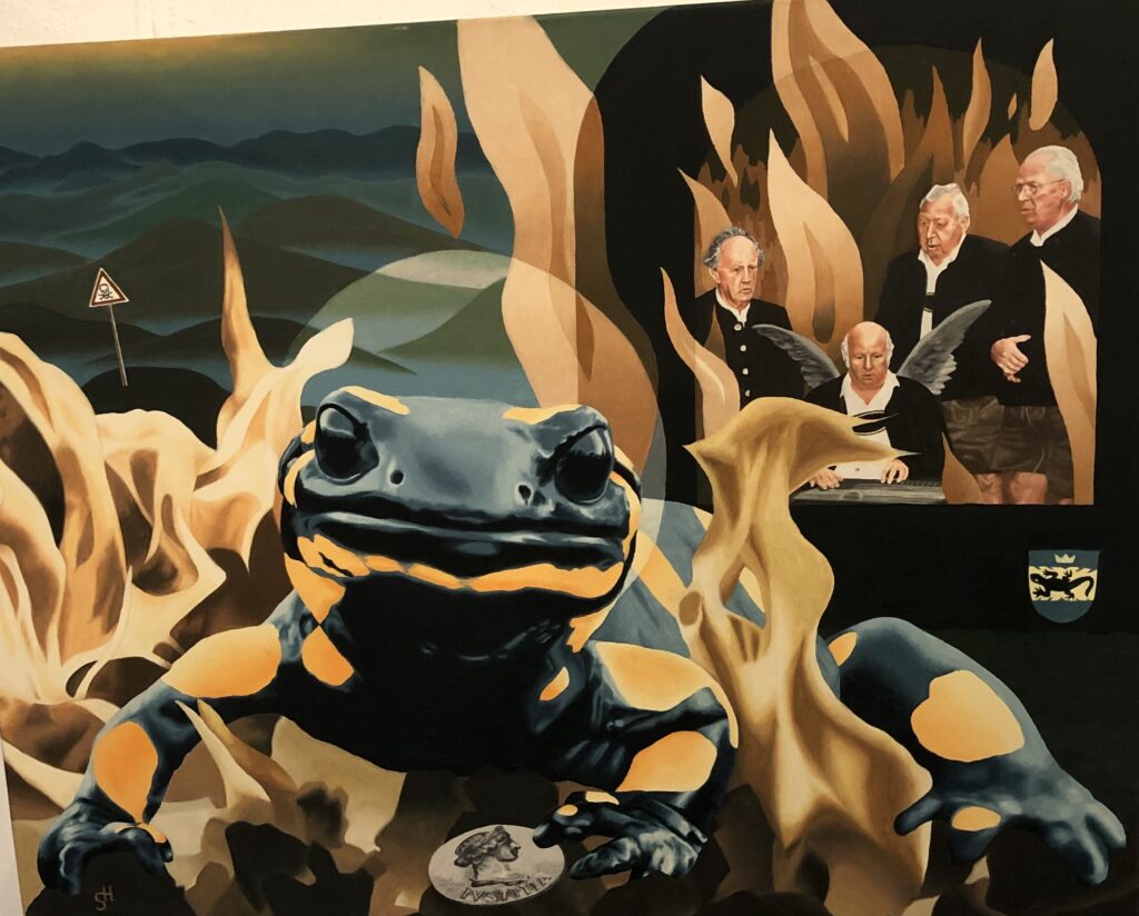 Hans Sagmeister zeigt in der Galerie im Alten Feuerwehrgerätehaus großformatige Ölbilder mit eigenwilliger Thematik. Jedes Bild erzählt eine Geschichte, die in mehrfacher Hinsicht zum Nachdenken anregt. Es ist die Absicht des Künstlers, durch seine ungewöhnlichen Darstellungen neue Perspektiven zu eröffnen. Der Themenkreis ist groß und wird von eingespielter Musik begleitet. In der gut besuchten Galerie begrüßte Martina Thalmayr den aus Samerberg stammenden Maler, der vor seiner Pensionierung Realschullehrer war und nach eigener Aussage seit früher Kindheit malt. Mensch und Tier spielen gleichermaßen wichtige Rollen, große Affen und kleine Vögel sind malerisch perfekt in den Bildern festgehalten. Viele Werke haben ihre Erläuterung in ausgedruckten Seiten an der Wand hängen, manche erklärte Sagmeister selber auf Befragen von Martina Thalmayr. Eine riesige Schnecke, die ihr Haus mitschleppt, symbolisiert die Unfreiheit des Menschen und die Zwänge, denen er unterliegt. Kafkas „Verwandlung“ – ein Mensch mutiert über Nacht zu einem Käfer – ein riesiger, im Bild festgehaltener Käfer, dazu ein großes Wellblechdach, das ins Bild hineinragt, zeugen davon. Die Bilder haben fast alle das Format von einem Meter mal ein Meter. Sagmeister sammelt visuelle Eindrücke, die er auf Fotos findet. Diese Fotos stellt er dann zusammen zu einer Bildidee, und beginnt, nach Art der alten Meister zu malen. Eine wichtige Rolle spielt bei all seinen Werken die begleitende Musik, sei es Schuberts „Winterreise“, Gustav Mahlers „Des Knaben Wunderhorn““ oder Popmusik aus neuerer Zeit.
