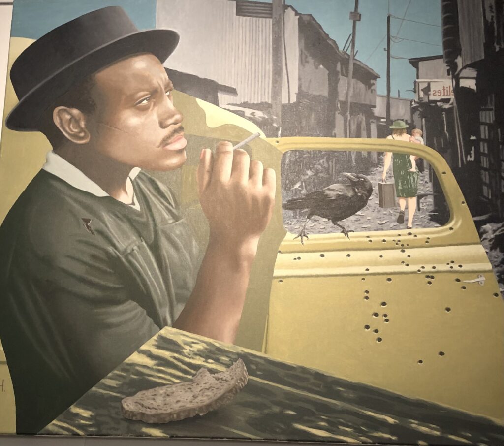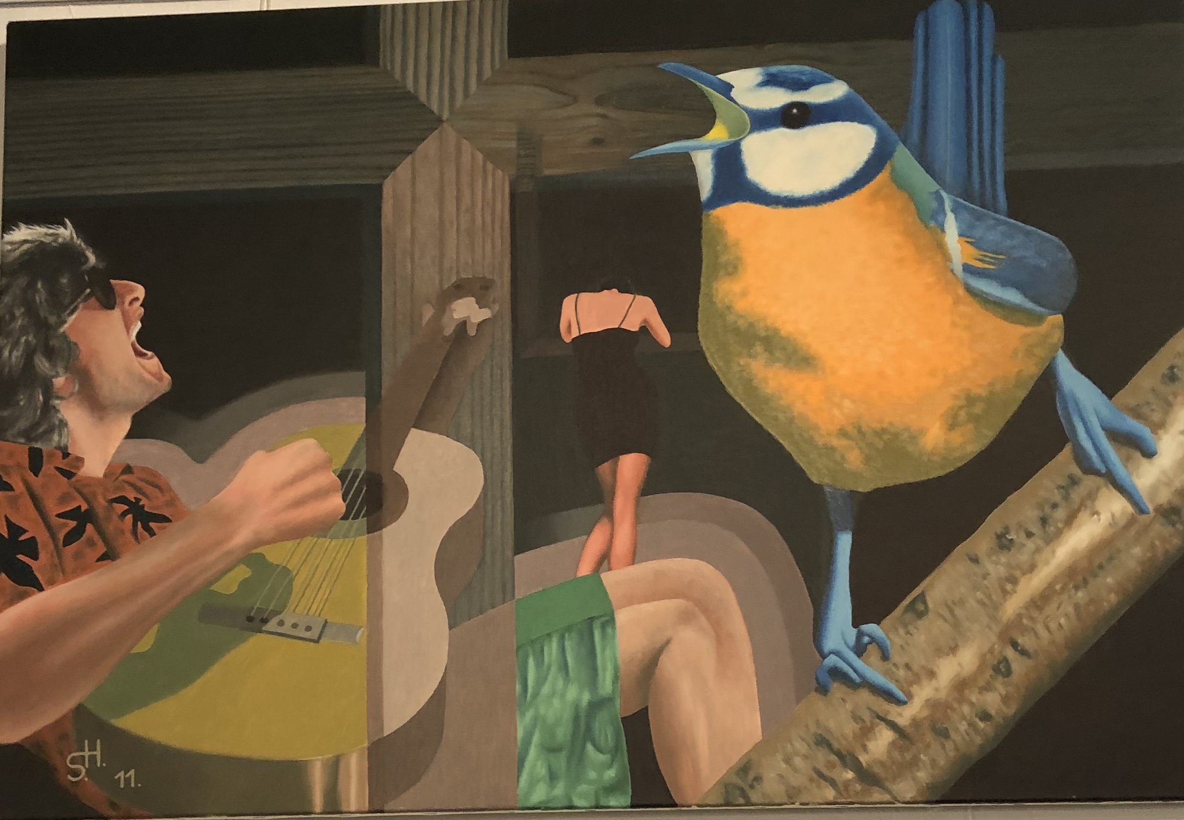Hans Sagmeister zeigt in der Galerie im Alten Feuerwehrgerätehaus großformatige Ölbilder mit eigenwilliger Thematik. Jedes Bild erzählt eine Geschichte, die in mehrfacher Hinsicht zum Nachdenken anregt. Es ist die Absicht des Künstlers, durch seine ungewöhnlichen Darstellungen neue Perspektiven zu eröffnen. Der Themenkreis ist groß und wird von eingespielter Musik begleitet. In der gut besuchten Galerie begrüßte Martina Thalmayr den aus Samerberg stammenden Maler, der vor seiner Pensionierung Realschullehrer war und nach eigener Aussage seit früher Kindheit malt. Mensch und Tier spielen gleichermaßen wichtige Rollen, große Affen und kleine Vögel sind malerisch perfekt in den Bildern festgehalten. Viele Werke haben ihre Erläuterung in ausgedruckten Seiten an der Wand hängen, manche erklärte Sagmeister selber auf Befragen von Martina Thalmayr. Eine riesige Schnecke, die ihr Haus mitschleppt, symbolisiert die Unfreiheit des Menschen und die Zwänge, denen er unterliegt. Kafkas „Verwandlung“ – ein Mensch mutiert über Nacht zu einem Käfer – ein riesiger, im Bild festgehaltener Käfer, dazu ein großes Wellblechdach, das ins Bild hineinragt, zeugen davon. Die Bilder haben fast alle das Format von einem Meter mal ein Meter. Sagmeister sammelt visuelle Eindrücke, die er auf Fotos findet. Diese Fotos stellt er dann zusammen zu einer Bildidee, und beginnt, nach Art der alten Meister zu malen. Eine wichtige Rolle spielt bei all seinen Werken die begleitende Musik, sei es Schuberts „Winterreise“, Gustav Mahlers „Des Knaben Wunderhorn““ oder Popmusik aus neuerer Zeit.