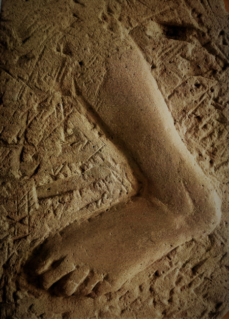 Dargestellt ist der gut erhaltene linke Fuß einer Moorleiche bis zur Mitte der Wade als Sandstein-Relief. Die Ausgrabung ist noch nicht vollständig beendet und man sieht die Grabungsspuren in der Umgebung.