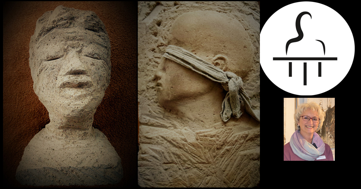 Das Sandstein-Relief stellt den Kopf einer Moorleiche mit der Schulterpartie dar. Durch die Konservierung im Moor sind die Weichteile sehr gut erhalten geblieben.
